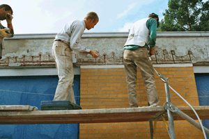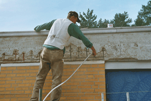Die Fassade wird mit Hochdruck gereinigt und nach Abtrocknung