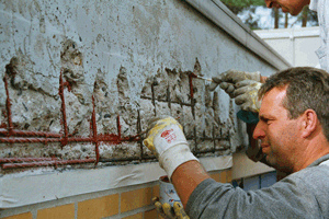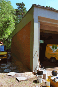 Auf die Fassade wird eine Fugenschlämme ganzflächig aufgetragen